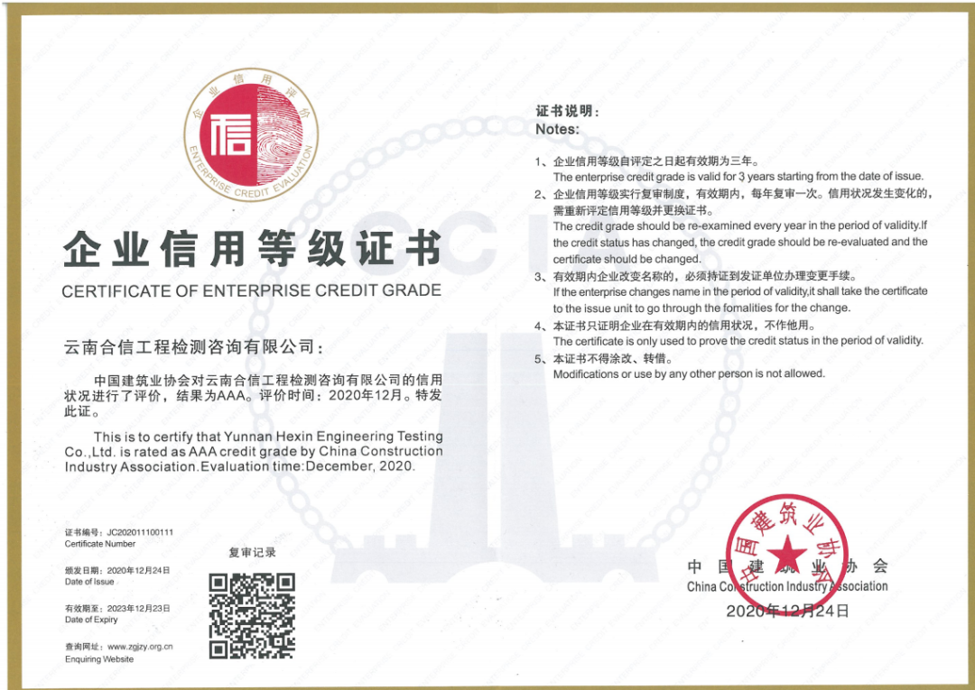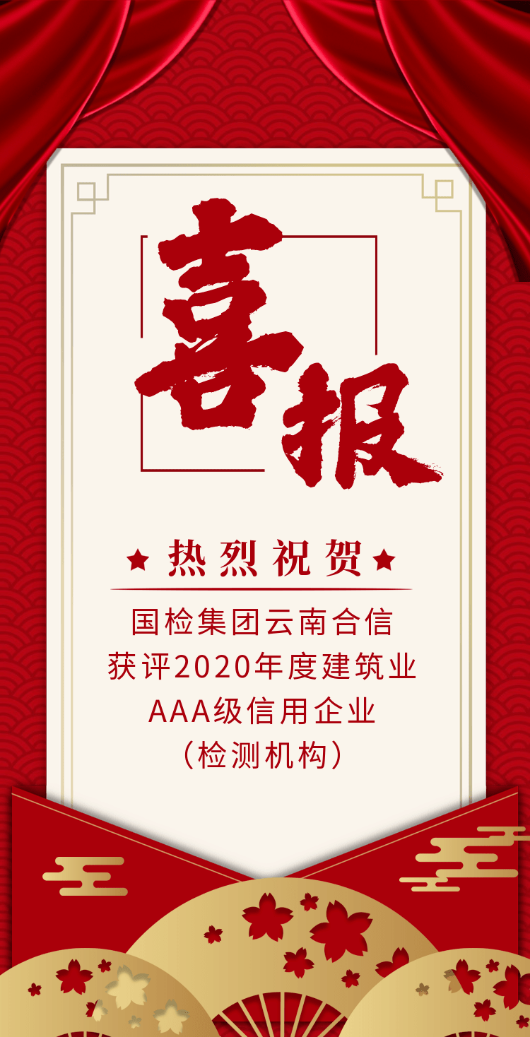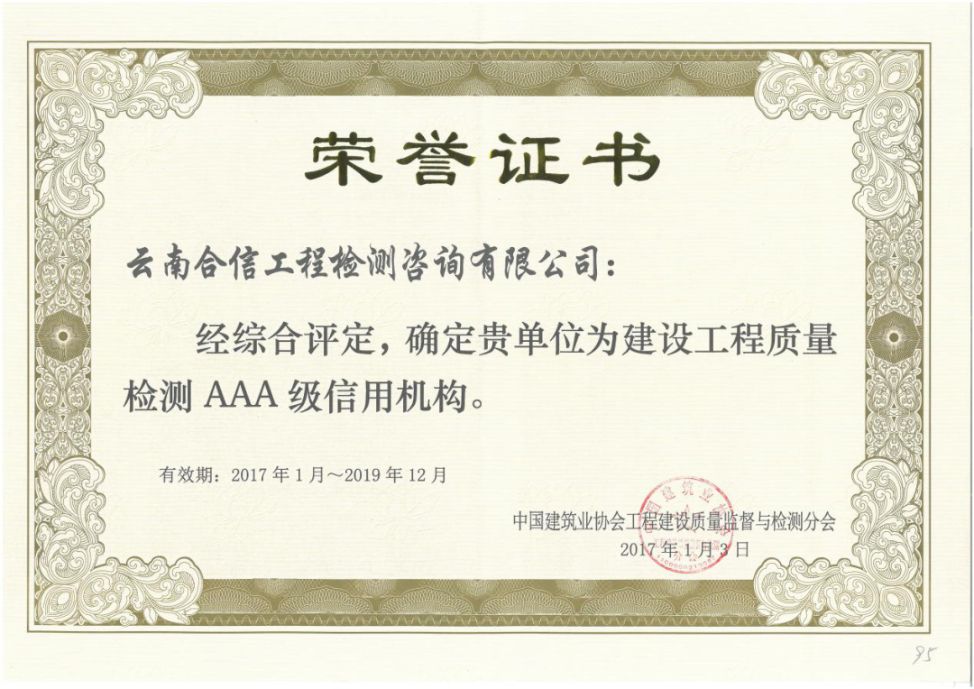 為進一步增強企業(yè)競爭力,加快企業(yè)信用體系建設,云南合信工程檢測咨詢有限公司根據中國建筑業(yè)協會質量管理與監(jiān)督檢測分會《關于開展2020年度建筑業(yè)AAA級信用企業(yè)(檢測機構)評價推薦工作的通知》要求,積極組織開展評價籌備工作;近日,中國建筑業(yè)協會質量管理與監(jiān)督檢測分會發(fā)布通知,我司榮獲由中國建筑業(yè)協會頒發(fā)的AAA級企業(yè)信用等級證書。