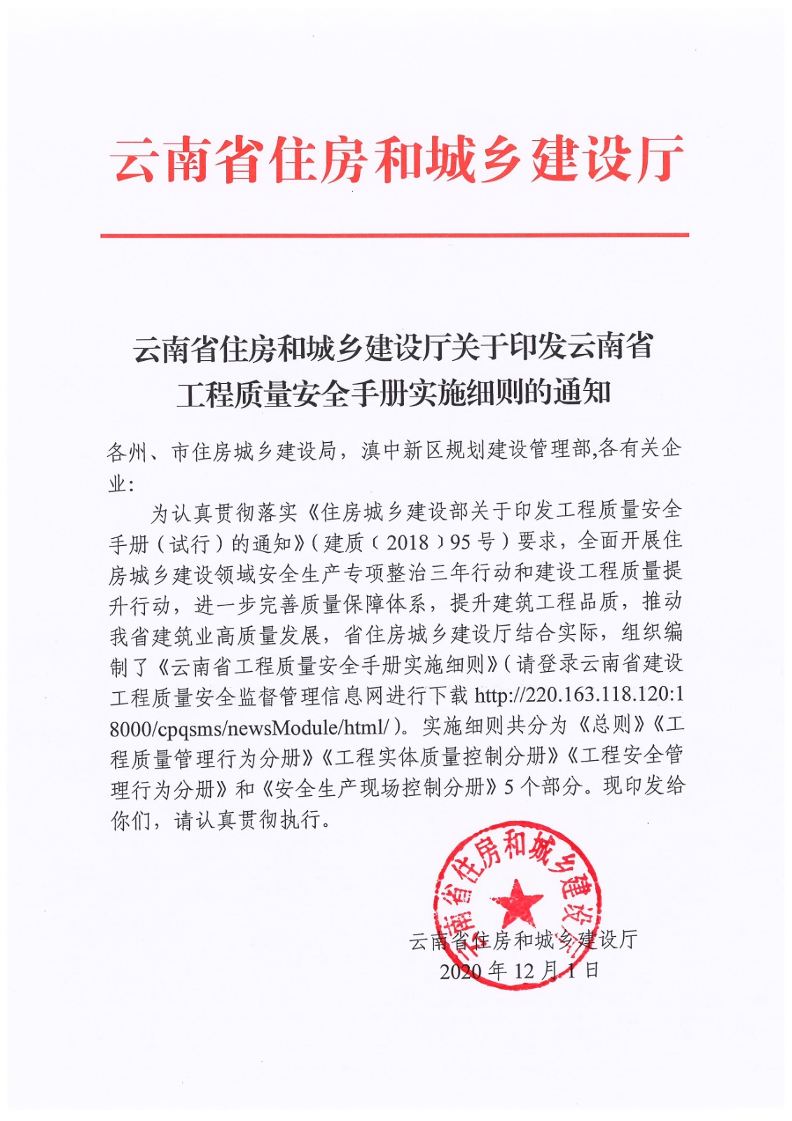 云南省住房和城鄉(xiāng)建設(shè)廳關(guān)于印發(fā)云南省工程質(zhì)量安全手冊實施細則的通知