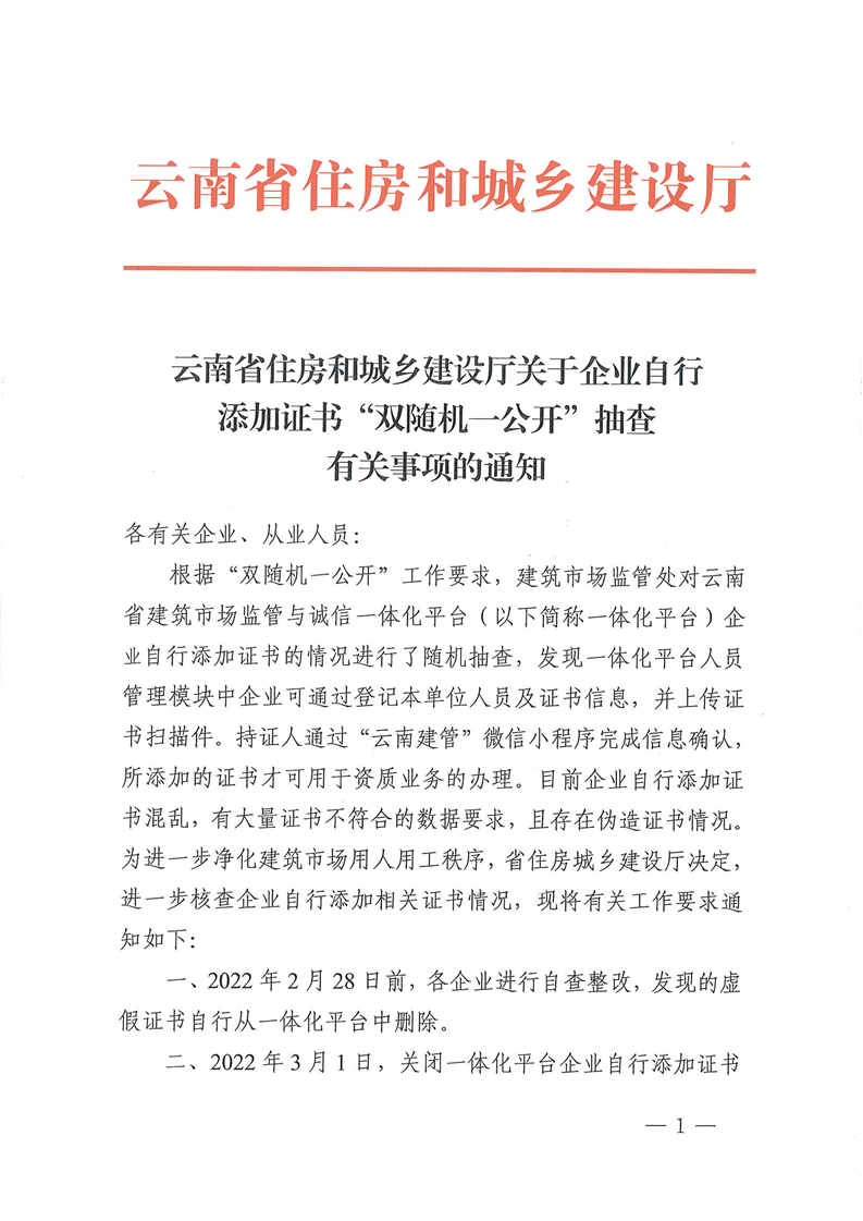 云南省住房和城鄉(xiāng)建設(shè)廳關(guān)于企業(yè)自行添加證書(shū)“雙隨機(jī)一公開(kāi)”抽查有關(guān)事項(xiàng)的通知